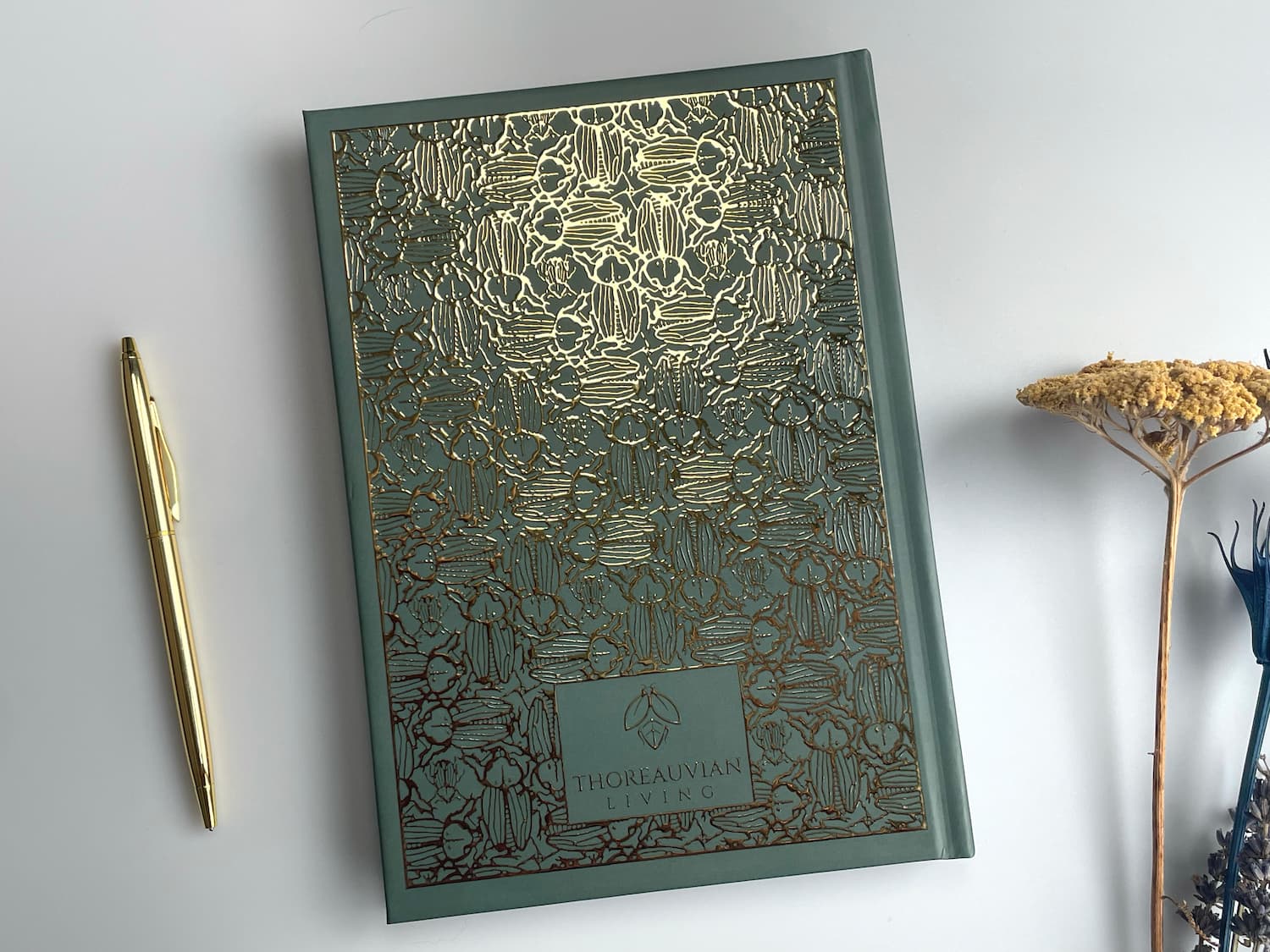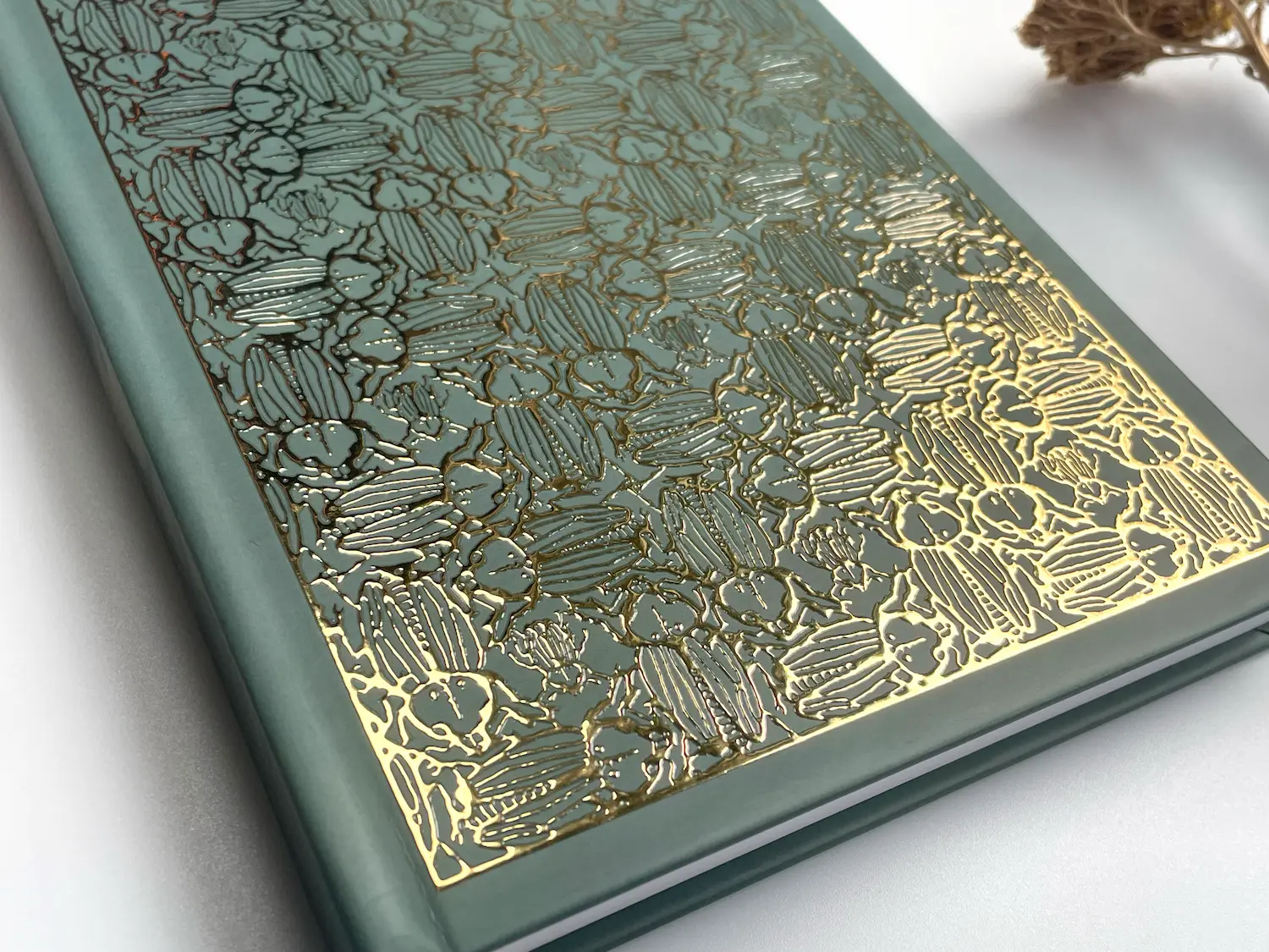 A truly special A5 hardback notebook, depicting a metallic foil detailing of your choosing on the front and back covers showcasing a repeat beetle design inspired by the natural beauty of nature.