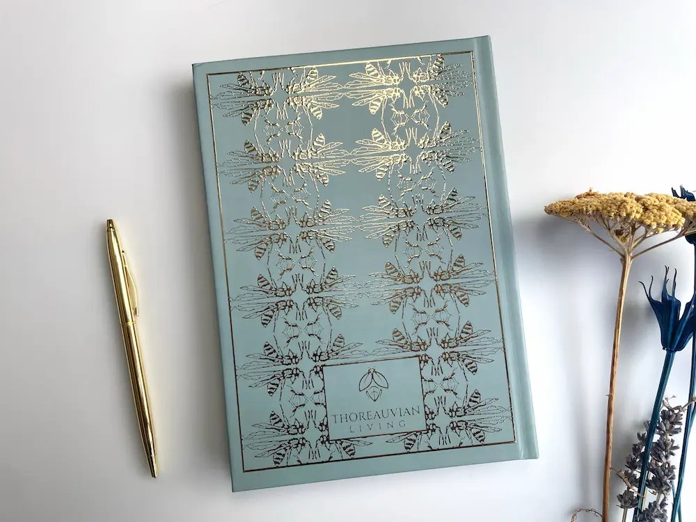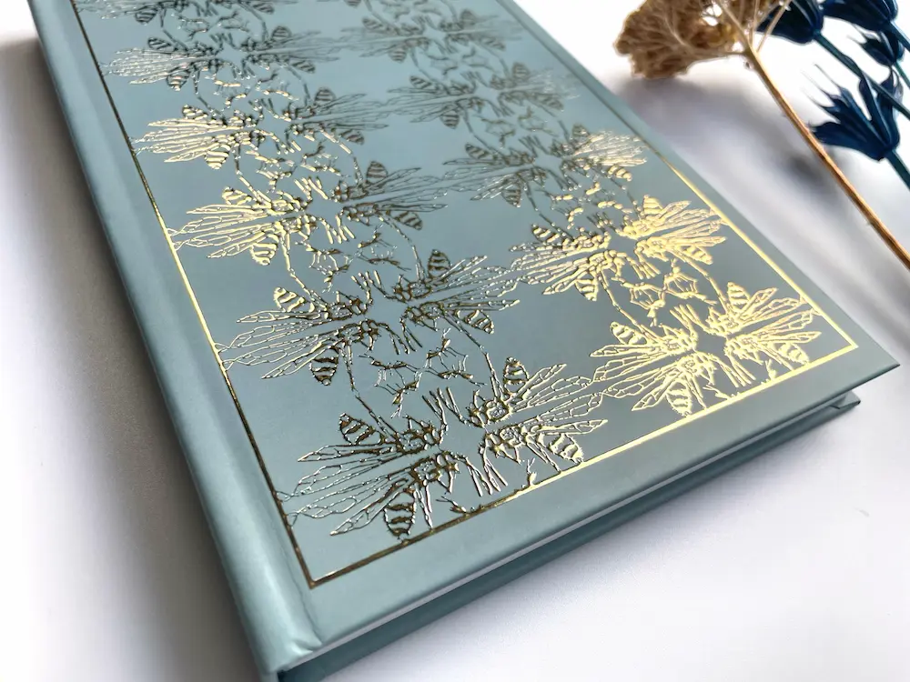 A truly special A5 hardback notebook, depicting a metallic foil detailing of your choosing on the front and back covers showcasing a honeybee and ant design inspired by the natural beauty of nature.